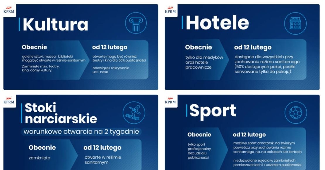 W dniu 11 lutego ukazało się kolejne rozporządzenie RM, dotyczące ograniczeń w związku ze stanem pandemii. Zmiany określone w rozporządzeniu dotyczą między innymi korzystania z obiektów sportowych. Od piątku 12 lutego będzie można wejść na boiska, znajdujące się w otwartym terenie. Niestety korzystanie z hal sportowych nadal jest możliwe tylko w przypadku sportu profesjonalnego. Wejście na boiska możliwe jest przy zachowaniu reżimu sanitarnego, nadal obowiązuje dezynfekcja rąk.