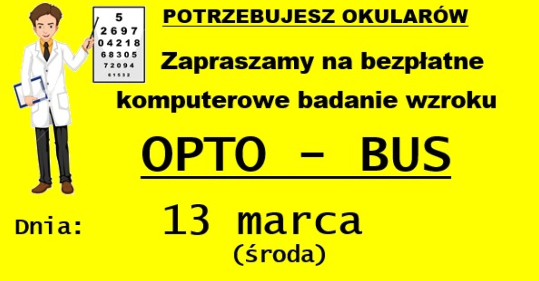 OPTO - BUS zaprasza13 marca (środa) na bezpłatne badania wzroku. Firma będzie czekać na chętnych na parkingu przy Gminnym Ośrodku Kultury w Ryczywole, ul. Nowa 2.