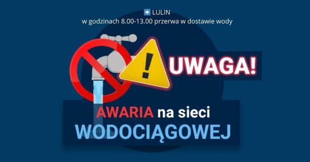We wtorek, 28.04.2026 r., w Lulinie doszło do awarii sieci wodociągowej. Mieszkańcy muszą liczyć się z brakiem wody w godzinach od 8:00 do 13:00.