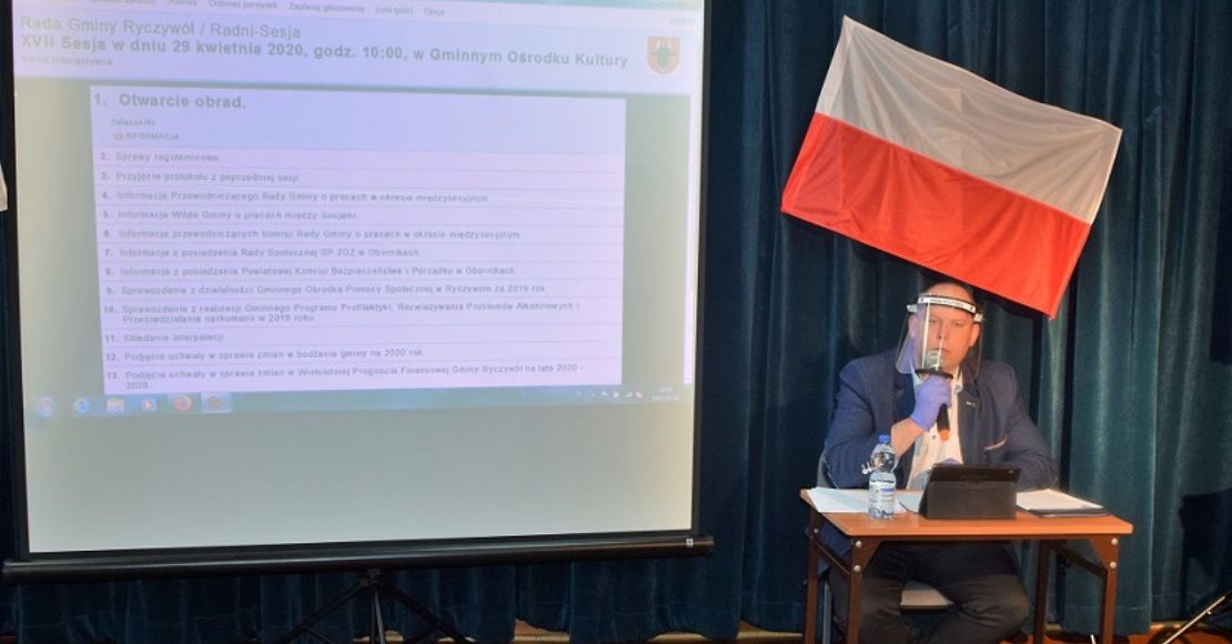 W dniu 29 kwietnia 2020 roku w Gminnym Ośrodku Kultury odbyła się XVII Sesja Rady Gminy. Mając na uwadze zachowanie środków ostrożności w czasie epidemii radni oraz pracownicy Urzędu Gminy przed wejściem na salę otrzymali maseczki oraz rękawiczki ochronne. Przewodniczący Rady Gminy po otwarciu obrad sesji przedstawił porządek obrad.