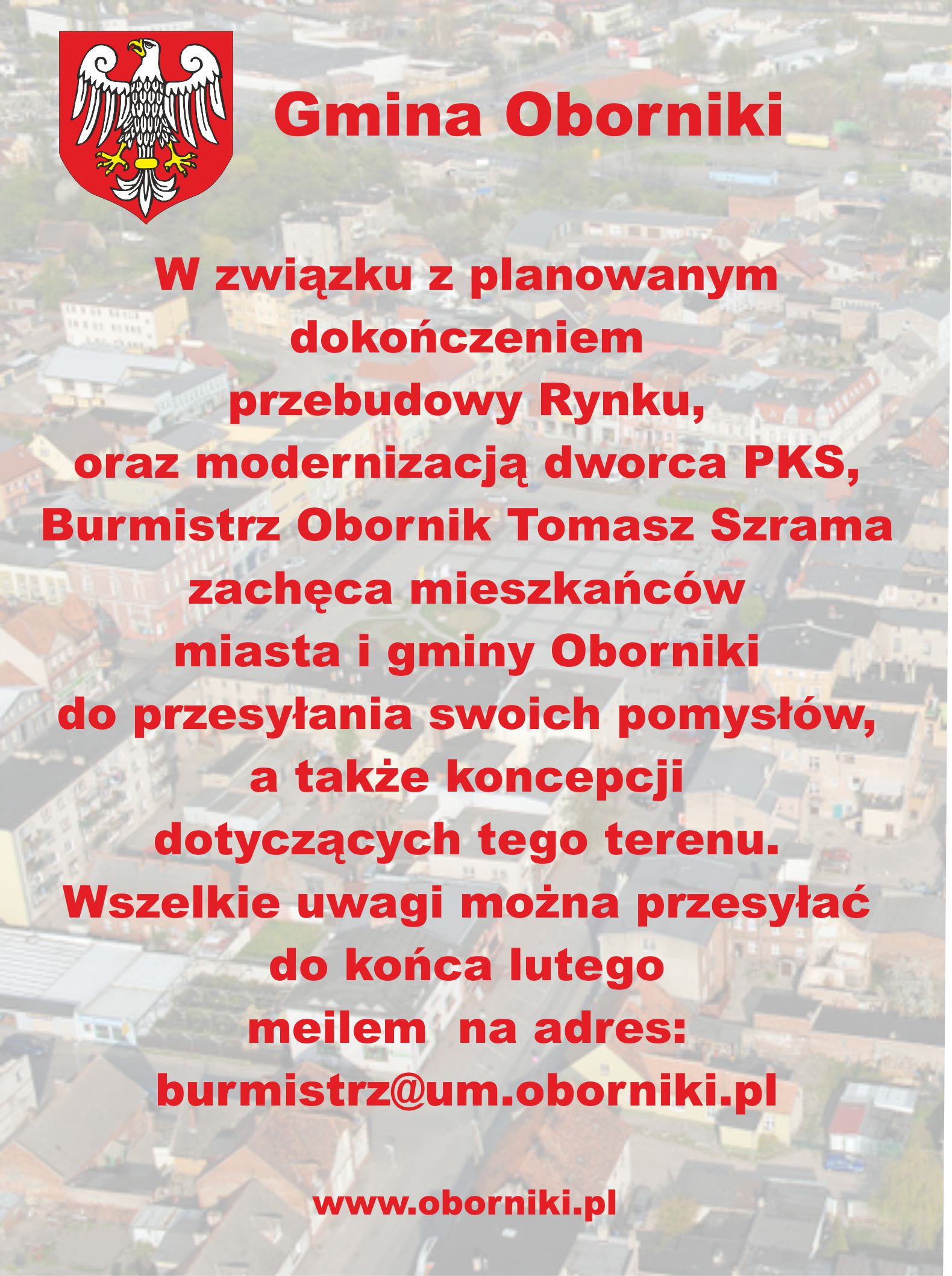 Burmistrz Obornik Tomasz Szrama zaprasza wszystkich do zgłaszania propozycji na zagospodarowanie terenu dworca autobusowego przy ul. Powstańców Wielkopolskich w Obornikach, ale także i Rynku.