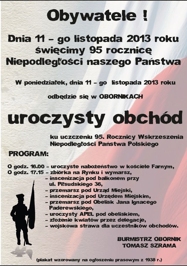 Jutro 11.11.2013r. Dzień Niepodległości będzie obchodzony w Obornikach. Jego głównym punktem będzie przemarsz przez miasto.