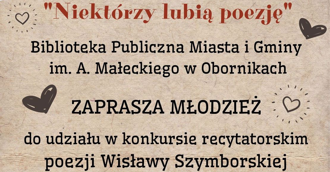 Konkurs jest upamiętnieniem 100. rocznicy urodzin polskiej noblistki Wiesławy Szymborskiej. Imprezie będzie towarzyszyła wystawa „Niektórzy lubią poezję” - Wisława Szymborska na fotografiach Joanny Helander. Chętnych do konkursu zgłasza szkoła, do której uczęszczają uczniowie. Rok 2023 został ustanowiony przez Senat Rzeczypospolitej Polskiej rokiem Wisławy Szymborskiej. Gorąco zachęcamy do udziału.