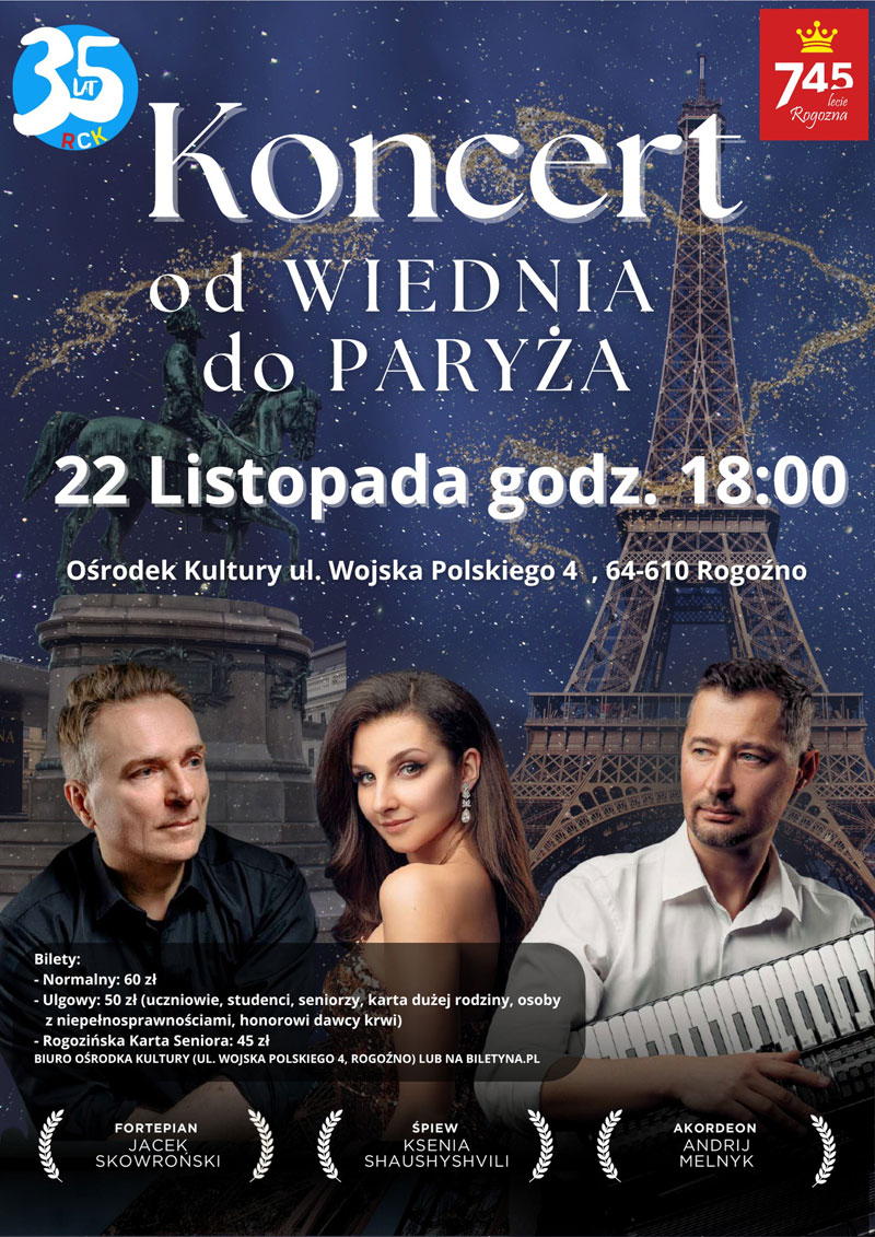 Centrum Kultury w Rogoźnie zaprasza na koncert „Od Wiednia do Paryża”, w którym zabrzmią najważniejsze europejskie klasyki oraz musicalowe przeboje.