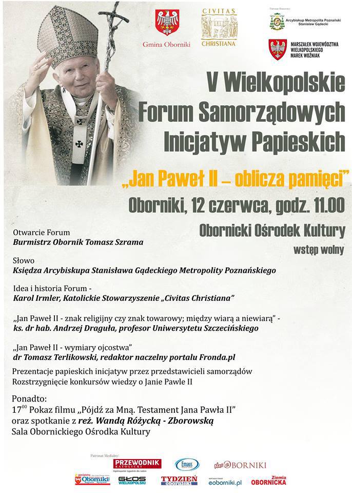 V Forum Samorządowe Inicjatyw Papieskich odbędzie się w Obornickim Ośrodku Kultury. Podczas spotkania prelegentami będą m.in.: Włodzimierz Chrzanowski z Katolickiego Stowarzyszenia Civitas Christiana, ks. dr had. Andrzej Draguła z Uniwersytetu Szczecińskiego oraz redaktor Tomasz Terlikowski.