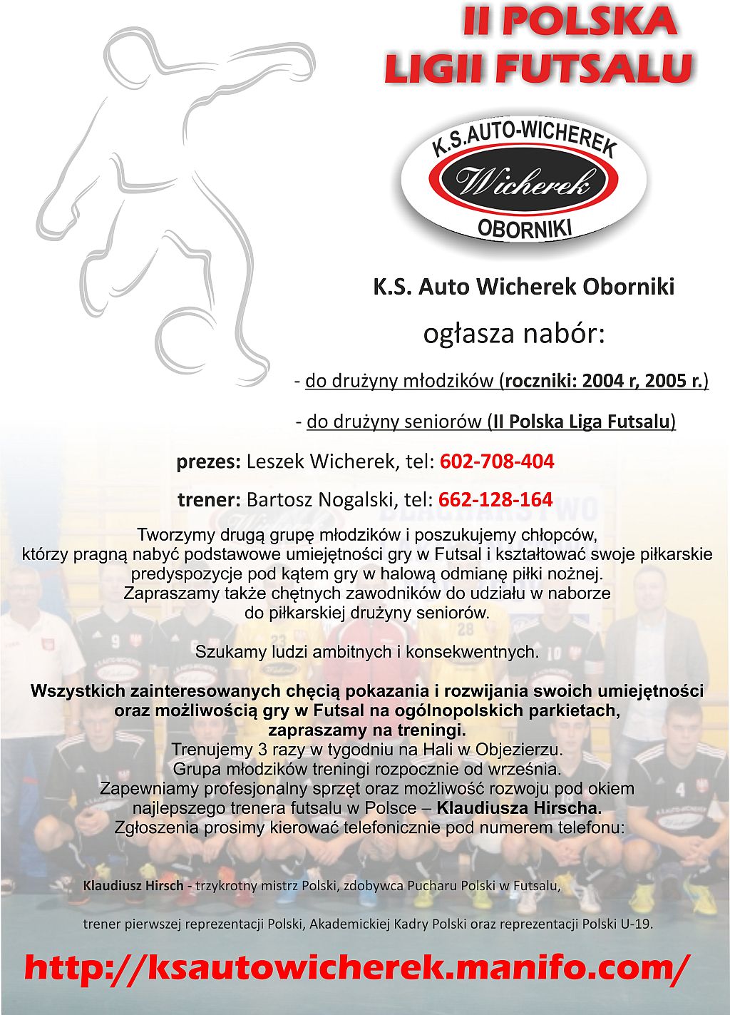 Zainteresowani grą swoich pociech, jak i seniorzy proszeni są o kontakt z Prezesem Leszkiem Wicherkiem lub z trenem Bartoszem Nogalskim. Numery telefonów dostępne są na poniższym plakacie.