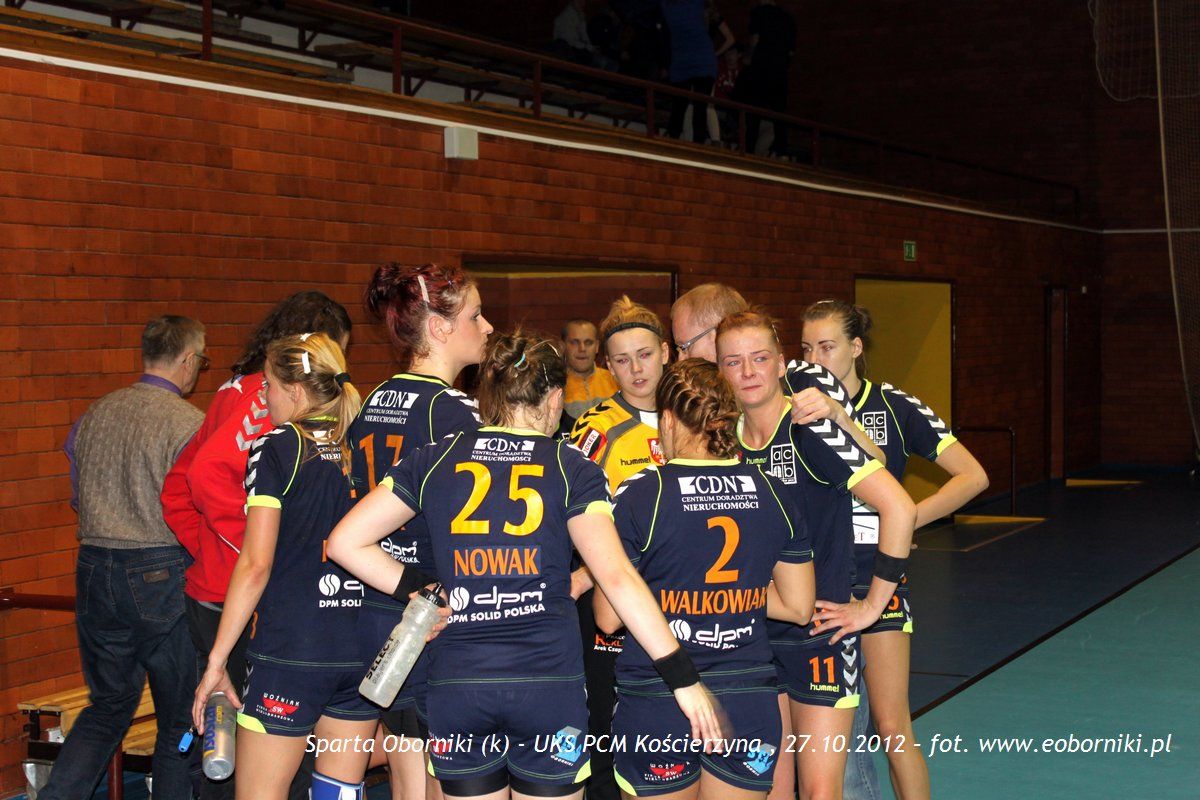 Żeńska drużyna Sparty podejmowała zespół z Kościerzyna. Od początku meczu prowadzenie objęła drużyna Tomasza Konitza i na przerwę schodziła z 2-bramkową przewagą (11:9). Korzystny rezultat utrzymywał się do ok. 45 minuty. Wówczas po kilku minutach bezbramkowej gry do remisu doprowadził zespół UKS PCM, a po chwili objął prowadzenie. Drużyna Sparty ambitnie walczyła o zwycięstwo w tym meczu. Niestety braki kondycyjne przyczyniały się do popełniania błędów, które utrudniały zdobywanie kolejnych bramek. W 59 minucie oborniczanki miały jeszcze szansę na zdobycie wyrównującej bramki, ale akcja nie powiodła się. Chwilę później zespół z Kościerzyna mógł się cieszyć z ważnego zwycięstwa w walce o awans do ekstraklasy.