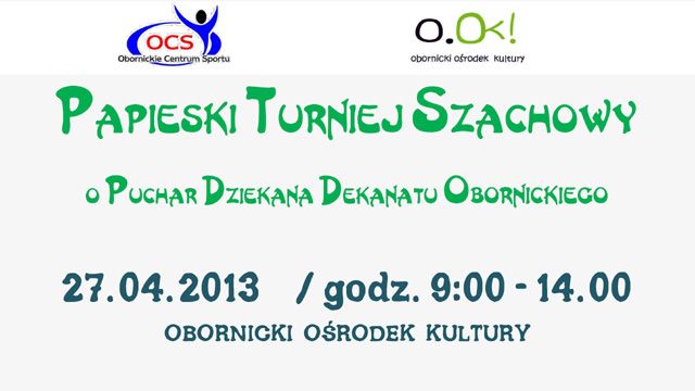 Szykuje się doskonała gratka dla miłośników szachów. W najbliższą sobotę 27.04 w godzinach od 9:00 do 14:00 rozegrany zostanie w OOK, Papieski Turniej Szachowy o Puchar Dziekana Dziekanatu Obornickiego.