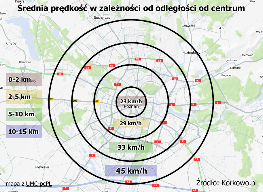 Dla porównania, jeszcze w listopadzie kierowcy w Poznaniu poruszali się ze średnią prędkością nie przekraczającą 18 km/h. Z dużo wyższą średnią prędkością jeżdżą także kierowcy w odległości 2-5 km od centrum. W godzinach komunikacyjnego szczytu wynosi ona 29 km/h. Korki tradycyjnie tworzą się na Bukowskiej i Dąbrowskiego.