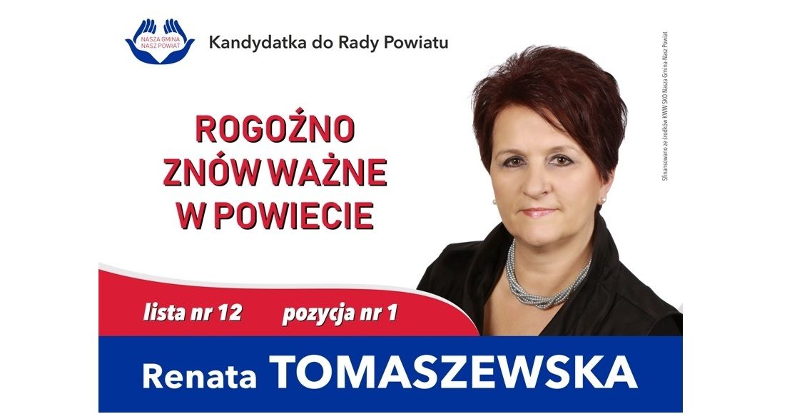Znana chyba każdemu mieszkańcowi Rogoźna, a także okolicznych miejscowości. Renata Tomaszeska- zastępca Burmistrza Rogoźna, postanowiła kandydować do Rady Powiatu Obornickiego. Jako że działalność administracji samorządowej zna od podszewki, jest otwarta na głos i potrzeby mieszkańców. Jako poprzedni Dyrektor Zespołu Szkół im. gen. Hipolita Cegielskiego doskonale potrafi porozumieć się z młodzieżą. Jest otwarta na współpracę z młodymi ludźmi.Priorytetami w działaniu kandydatki na radną powiatową jest przede wszystkim poprawa infastruktrury drogowej, racjonalizacja zadań związana z rozbudową szpitala oraz pozyskiwanie środków na szkolnictwo zawodowe.