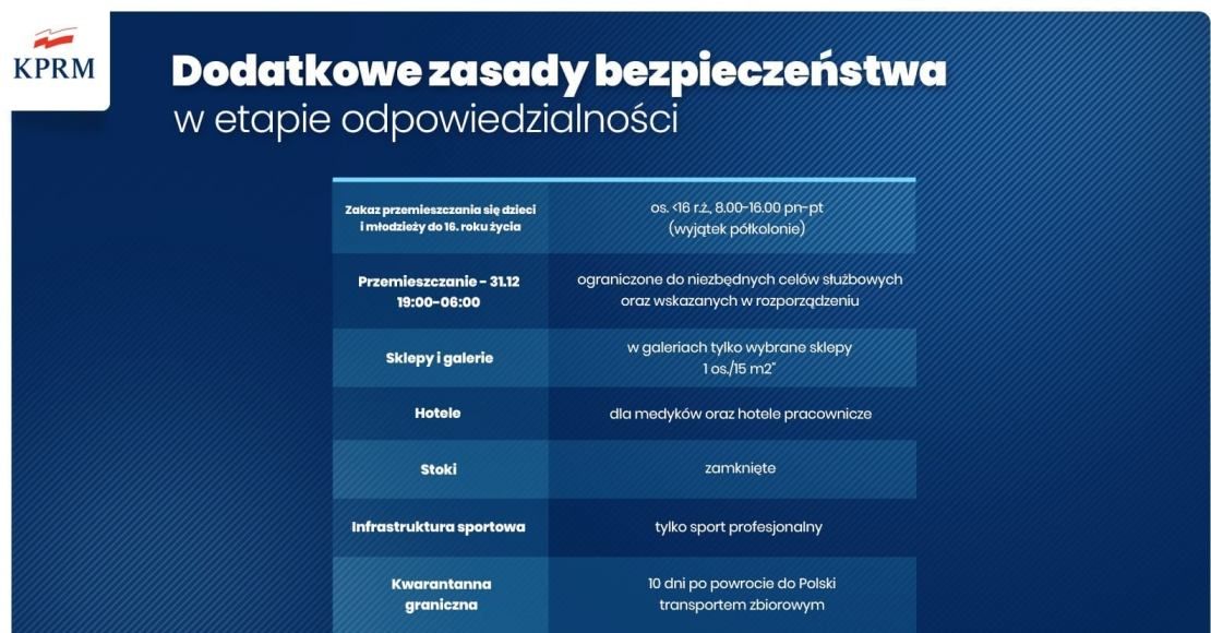 Rząd wprowadza kolejne restrykcje. Obowiązywać będą od 28 grudnia do 17 stycznia. Minister zdrowia Adam Niedzieski zapowiedział m.in. zamknięcie stoków narciarskich i galerii handlowych. W tym czasie infrastruktura sportowa będzie dostępna tylko do uprawiania sportu zawodowego. W noc sylwestrową wprowadzona zostanie godzina policyjna. Zakaz przemieszczania się będzie obowiązywał w godzinach 19:00 31 grudnia do godz. 06:00 1 stycznia.