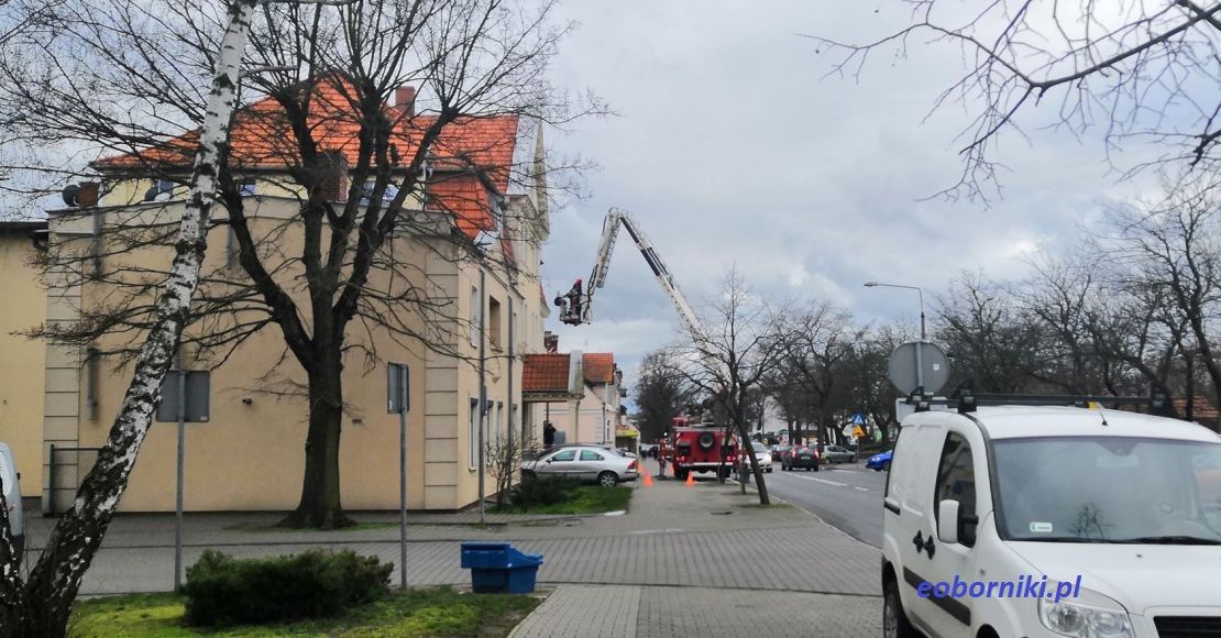 Strażacy z Komendy Powiatowej Państwowej Straży Pożarnej użyli dźwigu w celu zabezpieczenia dachu na budynku obornickiej policji. Silny wiatr obluzował dachówki.