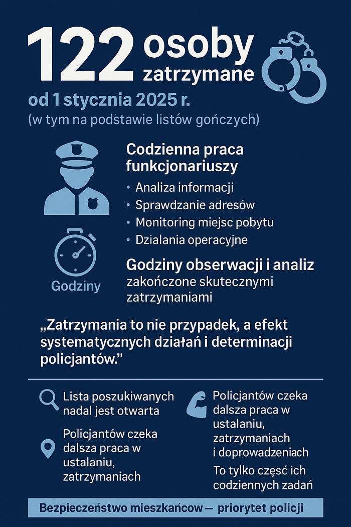 Od 1 stycznia 2025 roku policjanci z Komendy Powiatowej Policji w Obornikach oraz Komisariatu Policji w Rogoźnie zatrzymali w sumie 122 osoby poszukiwane, w tym na podstawie listu gończego. To efekt codziennej, żmudnej pracy funkcjonariuszy, którzy konsekwentnie ustalają miejsca pobytu osób ukrywających się przed wymiarem sprawiedliwości.