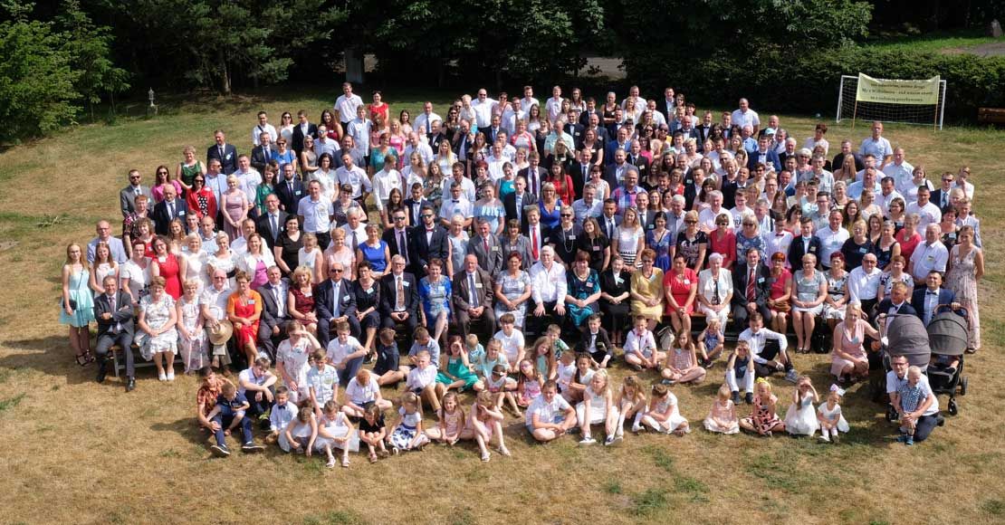 Po nabożeństwie wszyscy ruszyli w stronę Rożnowic, gdzie udało się znaleźć salę i piękne otoczenie mieszczące dokładnie 297 gości. Najmłodszy uczestnik skończył właśnie 2 miesiące, najstarszym była 85-letnia ciocia Genia Zagrodnik z Brzezin.