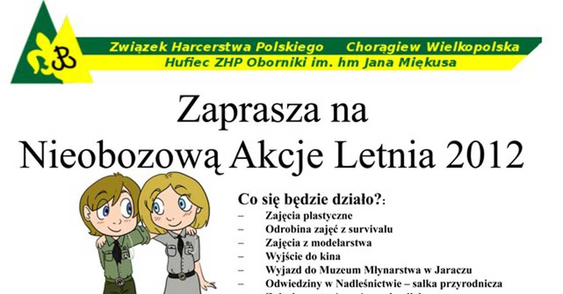 Hufiec ZHP im. hm Jana Miękusa w Obornikach zaprasza dzieci klas III-VI Szkoły Podstawowej i I klasy Gimnazjum na II Turnus Nieobozowej Akcji Letniej 2012, rozpoczyna się 7.07 i będzie trwał do 11.07.2012r.