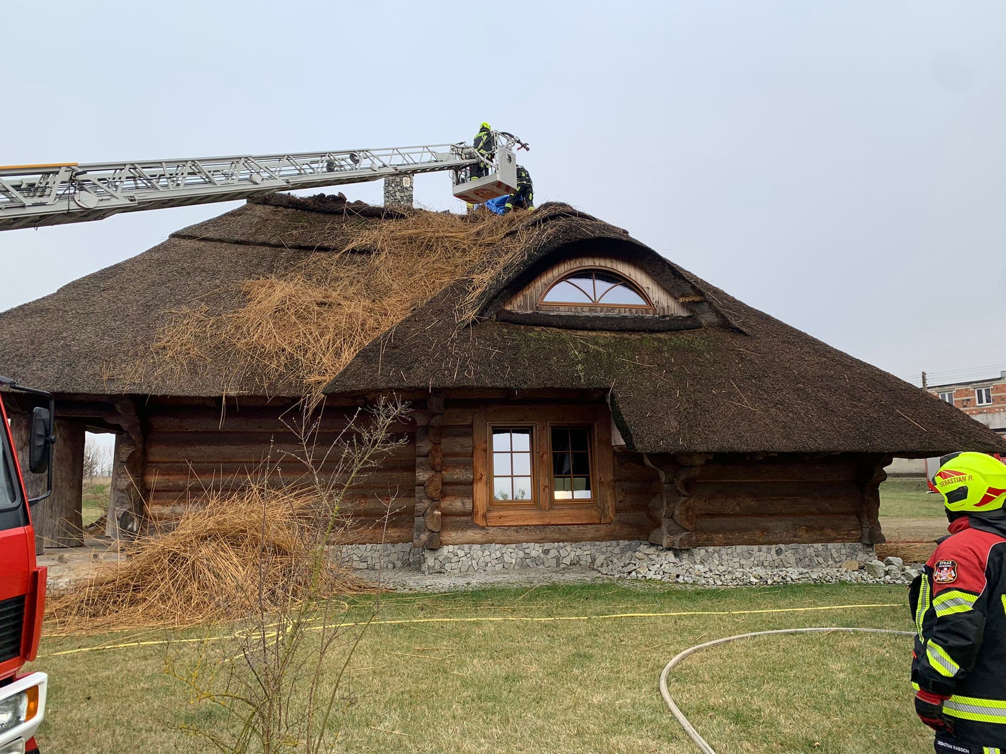 Po dojeździe na miejsce zdarzenia KDR stwierdził że, pali się dach pokryty strzechą na budynku drewnianym, jednorodzinnym. Przed przybyciem JOP mieszkańcy (3 osoby) opuścili budynek o własnych siłach i nie wymagali udzielenia pomocy medycznej. Działania strażaków polegały na zabezpieczeniu miejsca zdarzenia, podanieu trzech prądów wody w natarciu na palący się dach, pracach rozbiórkoweych dachu, przewietrzaniu pomieszczeń, sprawdzeniu pogorzeliska oraz wszystkich pomieszczeń w budynku przy pomocy kamery termowizyjnej i miernika wielogazowego – brak zagrożenia oraz zabezpieczeniu dachu plandeką.