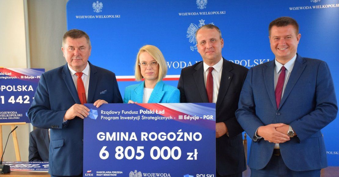 Wojewoda Wielkopolski Pan Michał Zieliński, w obecności Posłów na Sejm RP Pani Marty Kubiak i Pana Marcina Porzucka, wręczył burmistrzowi Romanowi Szuberskiemu symboliczny czek potwierdzający przyznanie dofinansowania z BGK dla Gminy Rogoźno w wysokości 6 805 000, 00 złotych z trzeciej edycji Rządowego Funduszu Polski Ład: Programu Inwestycji Strategicznych - PGR.