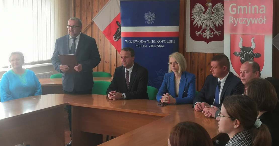 We wtorek 20 września do Ryczywołu przyjechał Wojewoda Wielkopolski Michał Zieliński. Towarzyszyli mu m.in. parlamentarzyści Marta Kubiak i Marcin Porzucek. Celem spotkania było przekazania laptopów w ramach projektu grantowego „Wsparcie dzieci z rodzin pegeerowskich w rozwoju cyfrowym – Granty PPGR”.