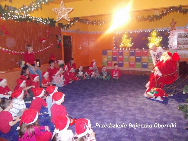 Do przedszkola przyszedł listonosz z listem poleconym od Mikołaja, w którym to było napisane, gdzie dzieci mają go szukać. Były między innymi w kościele Miłosierdzia Bożego, gdzie wraz z księdzem proboszczem Zbigniewem Urnym pomodliły się i zaśpiewały kolędy. Dalej udały się na obornicki Rynek, gdzie zamiast Mikołaja na dzieci czekał znowu list od niego, w którym to Mikołaj przeprosił dzieci, że go nie ma i kazał im się udać do przedszkola.. Po powrocie do „Bajeczki” dzieci piekły pierniki, rysowały postać św. Mikołaja tak jak go sobie wyobrażają a także wysłuchały historii o jego życiu połączonej z pokazem slajdów. Następnie za pomocą skype dzieci połączyły się z Rovaniemi i porozmawiały z pomocnikiem Św. Mikołaja. Poznały jego dom, pocztę oraz pracę pomocników. Gdy zapadł późny wieczór przedszkolaki trzymając w swych rączkach latarki udały się na poszukiwanie długo oczekiwanego gościa. Trafiły nawet do przedszkolnej piwnicy. Odnalazły go, kiedy właśnie wchodził przez komin. Dzieci zaprosiły Św. Mikołaja do sali kominkowej, ze specjalnie przygotowanym dla niego fotelem bujanym, gdzie śpiewały wraz z nim mikołajkowe piosenki, rozmawiały oraz wspólnie się bawiły. Na pożegnanie otrzymały prezenty. Przedszkolaki pełne wrażeń spokojnie przespały noc w przedszkolu.