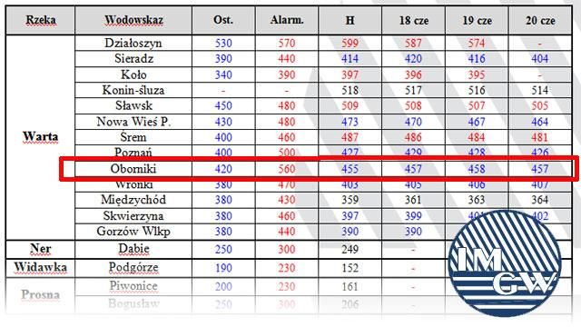 Warta od kilkunastu dni utrzymuje się powyżej stanu ostrzegawczego, który wynosi w Obornikach 420 cm. Na 22.06 prognozowany jest poziom 457 cm. Podajemy informacje dzięki Instytutowi Meteorologii i Gospodarki Wodnej.