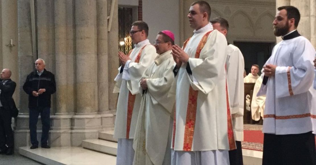 Fot.:Abp. Grzegorz Ryś i diakoni: Jakub Hejduk (z lewej) i Konrad Sulmierski, katedra łódzka, 18.5.2019.