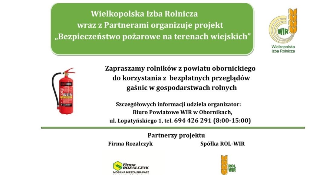 Wielkopolska Izba Rolnicza wraz z Partnerami realizuje projekt „Bezpieczeństwo pożarowe na terenach wiejskich”. Serdecznie zapraszamy rolników z powiatu obornickiego do korzystania z bezpłatnych przeglądów gaśnic w gospodarstwach rolnych.