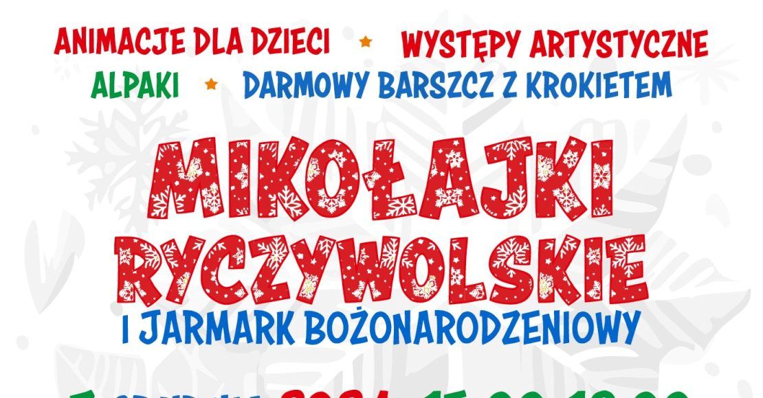 W sobotę 7 grudnia Gminny Ośrodek Kultury zaprasza na Mikołajki Ryczywolskie połączone z jarmarkiem. Na Placu 1 Maja przygotowane zostaną animacje dla dzieci. Będą występy artystyczne z udziałem m.in. Joanny Zaborowskiej, uczniów ryczywolskiej szkoły i obornickiej orkiestry. Będzie można dodatkowo poczęstować się darmowym barszczem z krokietem.