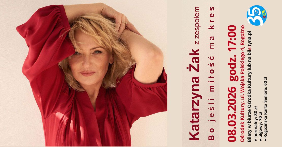 Rogozińskie Centrum Kultury przygotowało na nadchodzący Dzień Kobiet wyjątkowe wydarzenie artystyczne, które z pewnością przyciągnie miłośników nastrojowych brzmień. 8 marca 2026 roku o godzinie 17:00 na scenie przy ul. Wojska Polskiego 4 wystąpi znana i lubiana aktorka Katarzyna Żak. Program muzyczny zatytułowany „Bo jeśli miłość ma kres” to propozycja wpisująca się w klimat święta wszystkich pań.