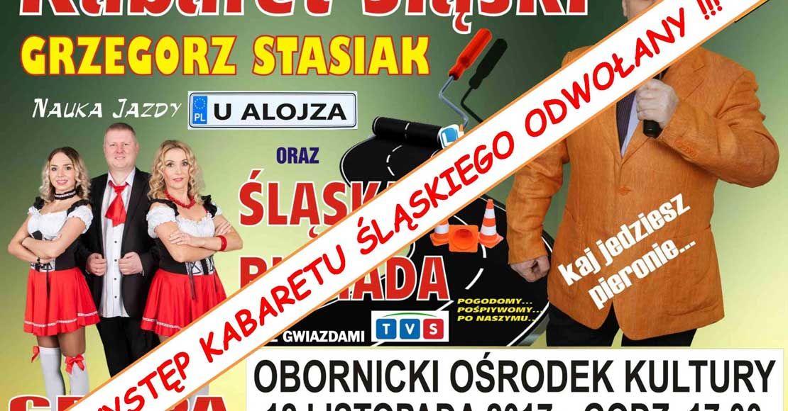 Z przyczyn niezależnych od Obornickiego Ośrodka Kultury występ ŚLĄSKIEGO KABARETU przewidziany w dniu 12 listopada br. zostaje przeniesiony na 27 stycznia 2018 roku.