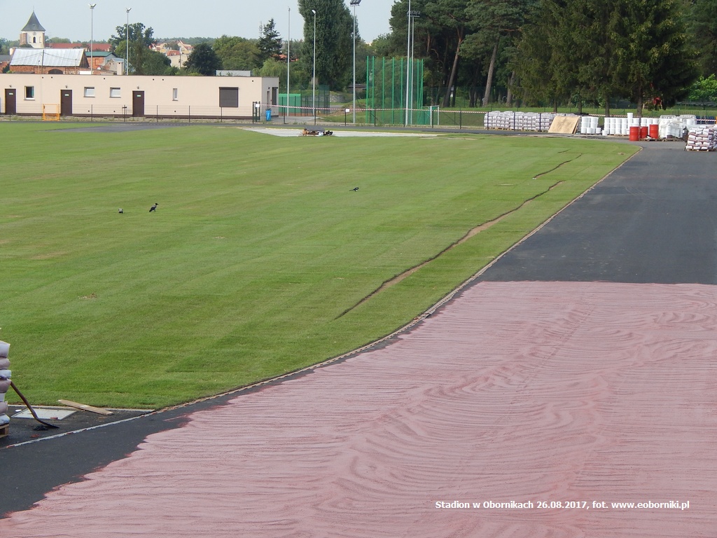 Pogoda przez kilka tygodni uniemożliwiała układanie murawy na obornickim Stadionie. Druga połowa sierpnia była już dużo łaskawsza i wykonawca mógł przystąpić do pracy. Choć do zakończenia inwestycji pozostało jeszcze dużo do zrobienia to już jednak są widoczne efekty.