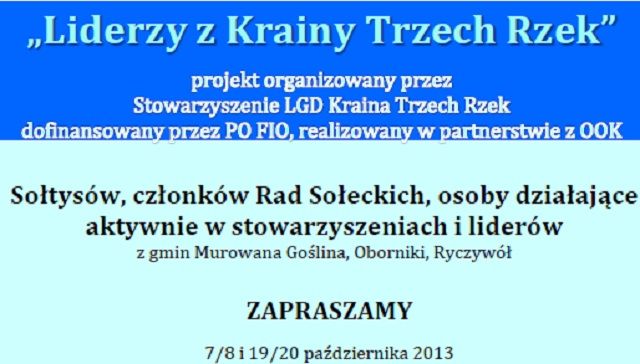 Udział w im mogą wziąć sołtysi, członkowie rad sołeckich oraz nieformalni działacze społeczni z gmin: Murowana Goślina, Oborniki i Ryczywół. Uczestnicy wezmą udział w dwóch 2-dniowych szkoleniach Kurs obejmuje 4 dni szkoleniowe. Zajęcia odbywać się będą w Zielonce, wsi górniczej Piła (kujawsko-pomorskie) i Obornikach, w październiku 2013 roku. Zajęcia poprowadzą dyplomowani trenerzy i nauczyciele. W ramach szkoleń organizator zapewnia materiały szkoleniowe w tym publikacje tematyczne oraz wyżywienie.