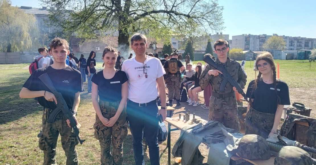 Na zdjęciu Dyrektor Jarosław Łatka z uczniami klasy wojskowej z ZS im. H. Cegielskiego w Rogoźnie.