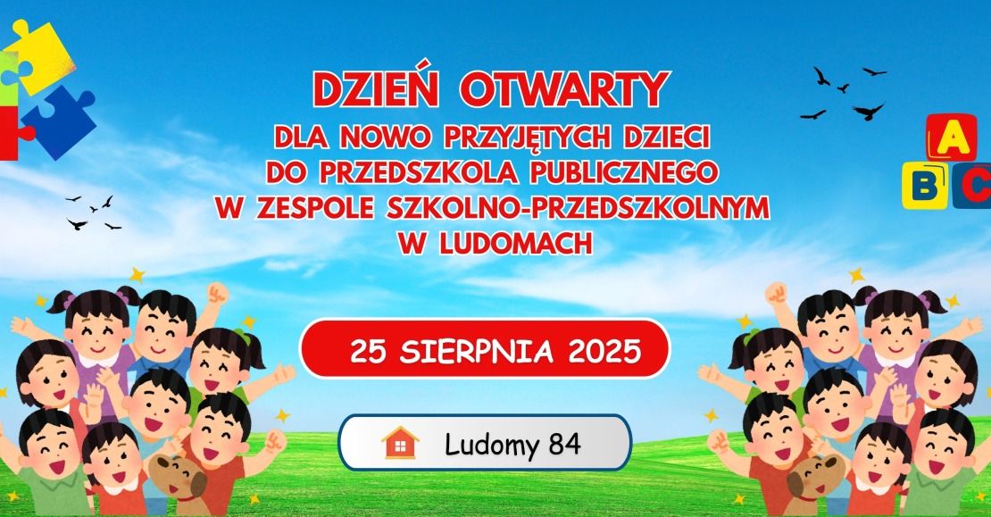 W poniedziałek, tj. 25 sierpnia, odbędzie się dzień otwarty dla nowo przyjętych dzieci do Przedszkola Publicznego w Zespole Szkolno-Przedszkolnym w Ludomach.