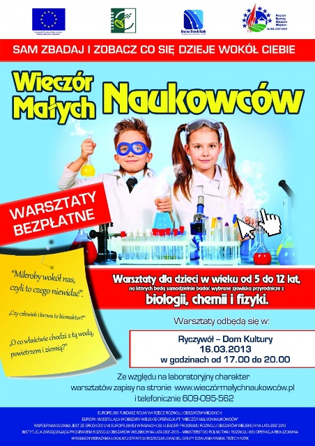 “Wieczór małych naukowców” – sam zbadaj i zobacz co się dzieje wokół ciebie – to propozycja warsztatów i pokazów dla dzieci, w szczególności zamieszkujących tereny wiejskie, starszych przedszkolaków i dzieci wczesnoszkolnych, na których będą samodzielnie badać wybrane zjawiska przyrodnicze z biologii, chemii i fizyki.